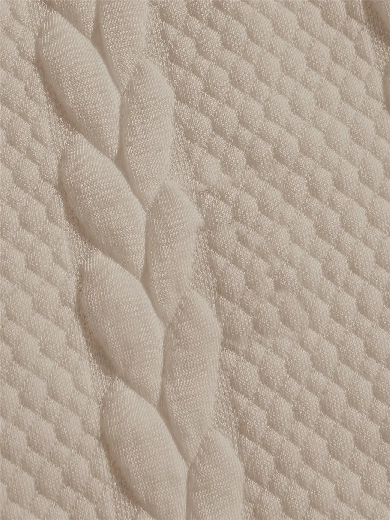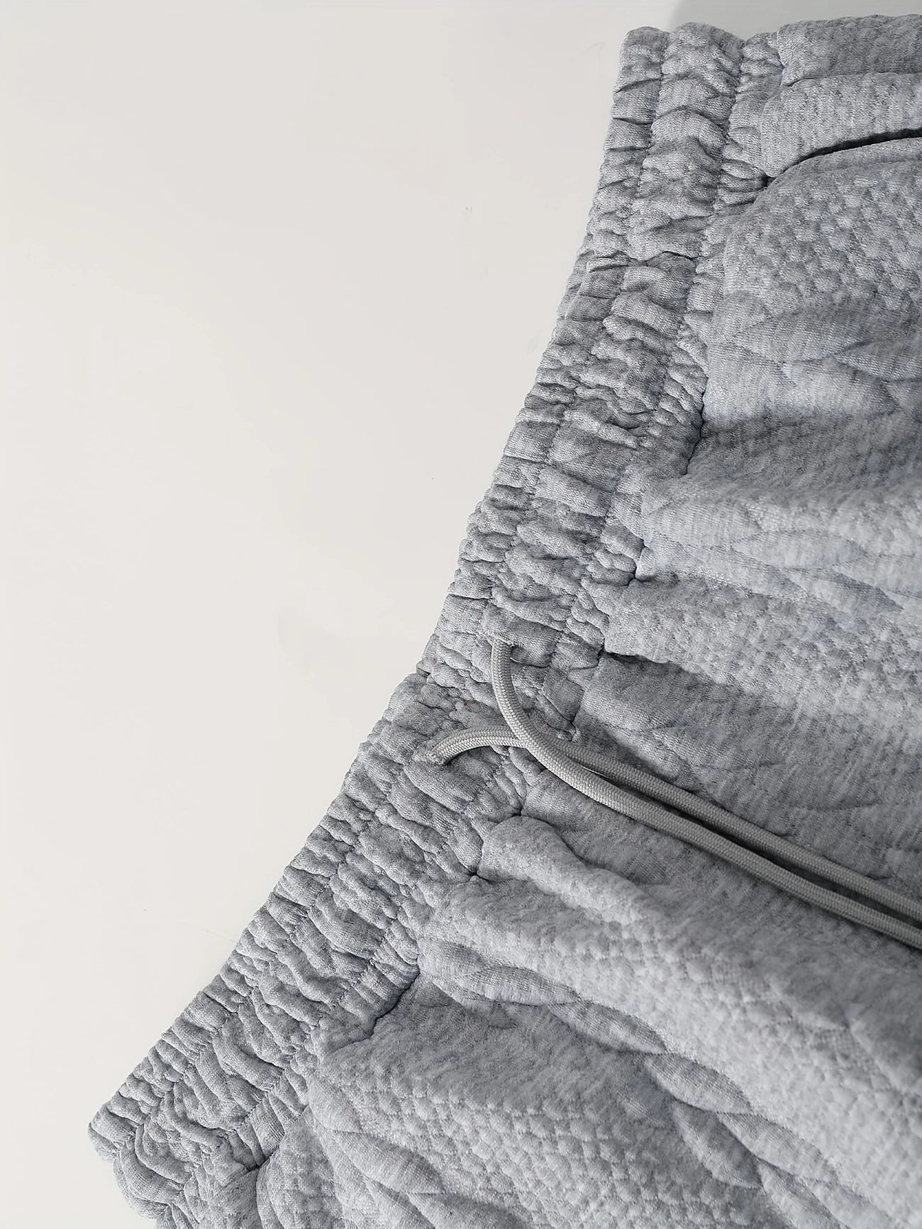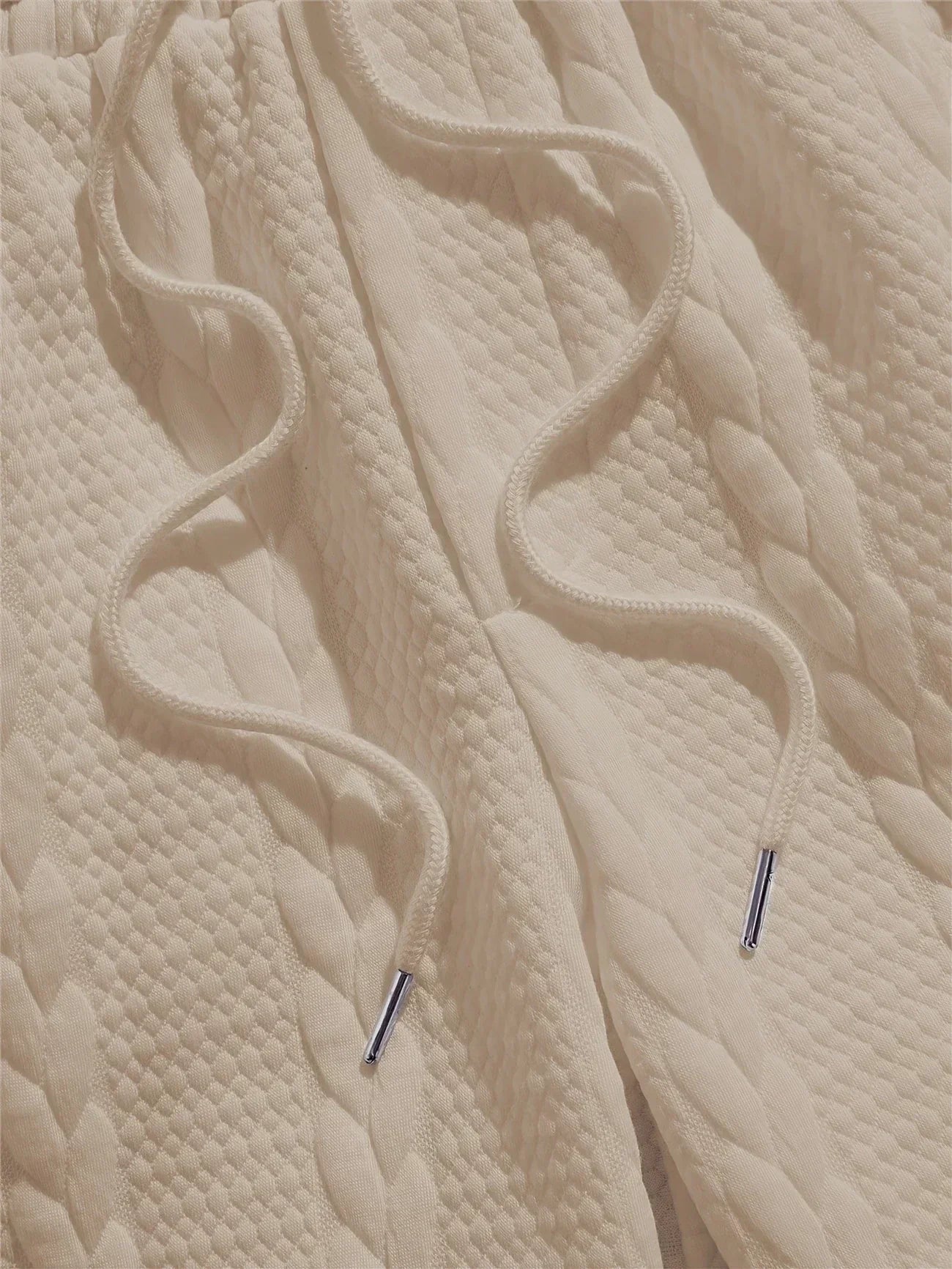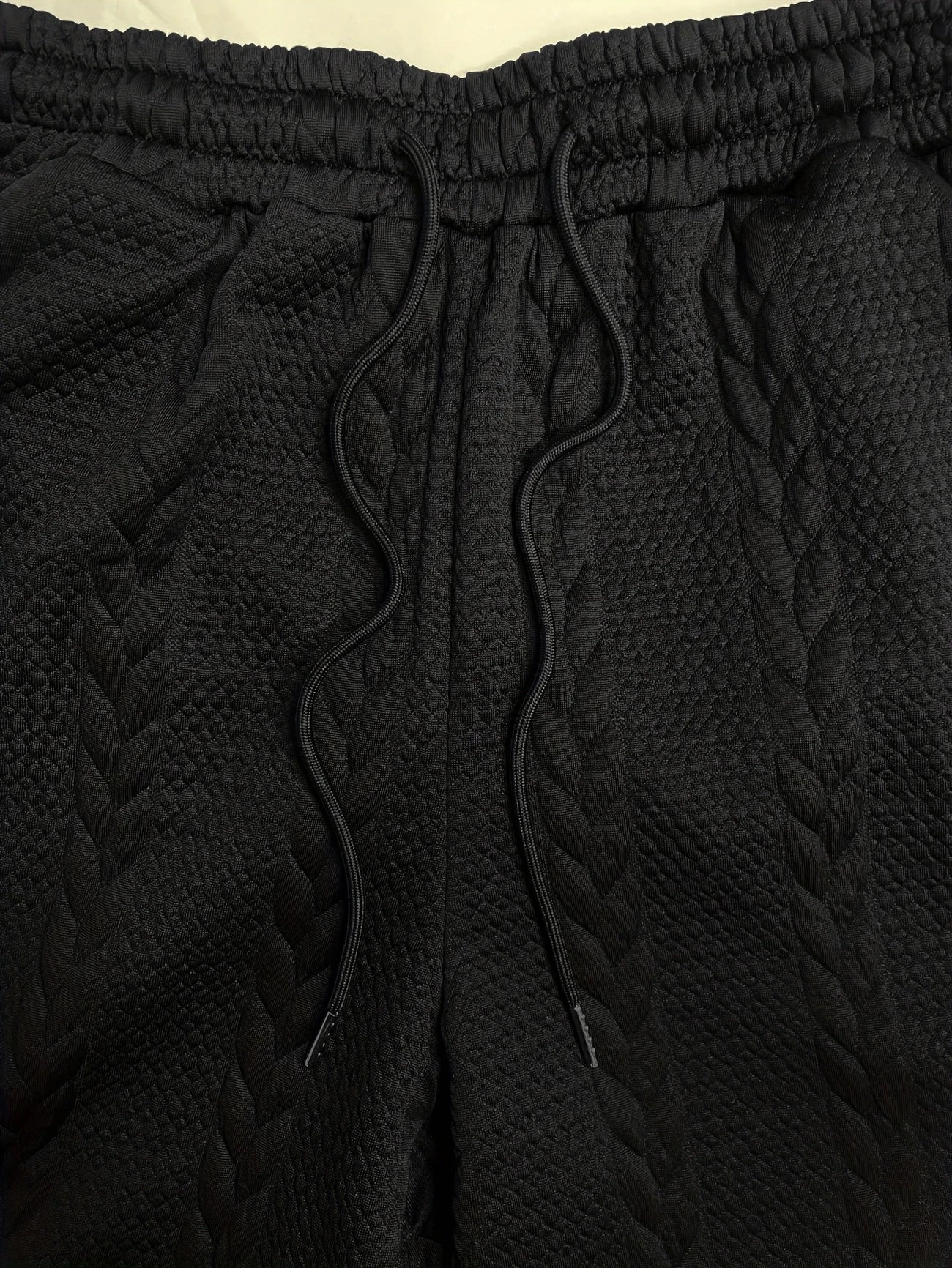 スタイリッシュなテクスチャードデザイン:  独自のケーブル編みパターンが特徴のこのセットは、クラシックなリラクシングウェアにモダンなアクセントを加えます。詳細なテクスチャが深みと視覚的な魅力を添え、単なるベーシックセットを超えたデザインです。クリーンなラインとミニマリストな雰囲気が、手軽にスタイリッシュにまとめるな印象を演出します。