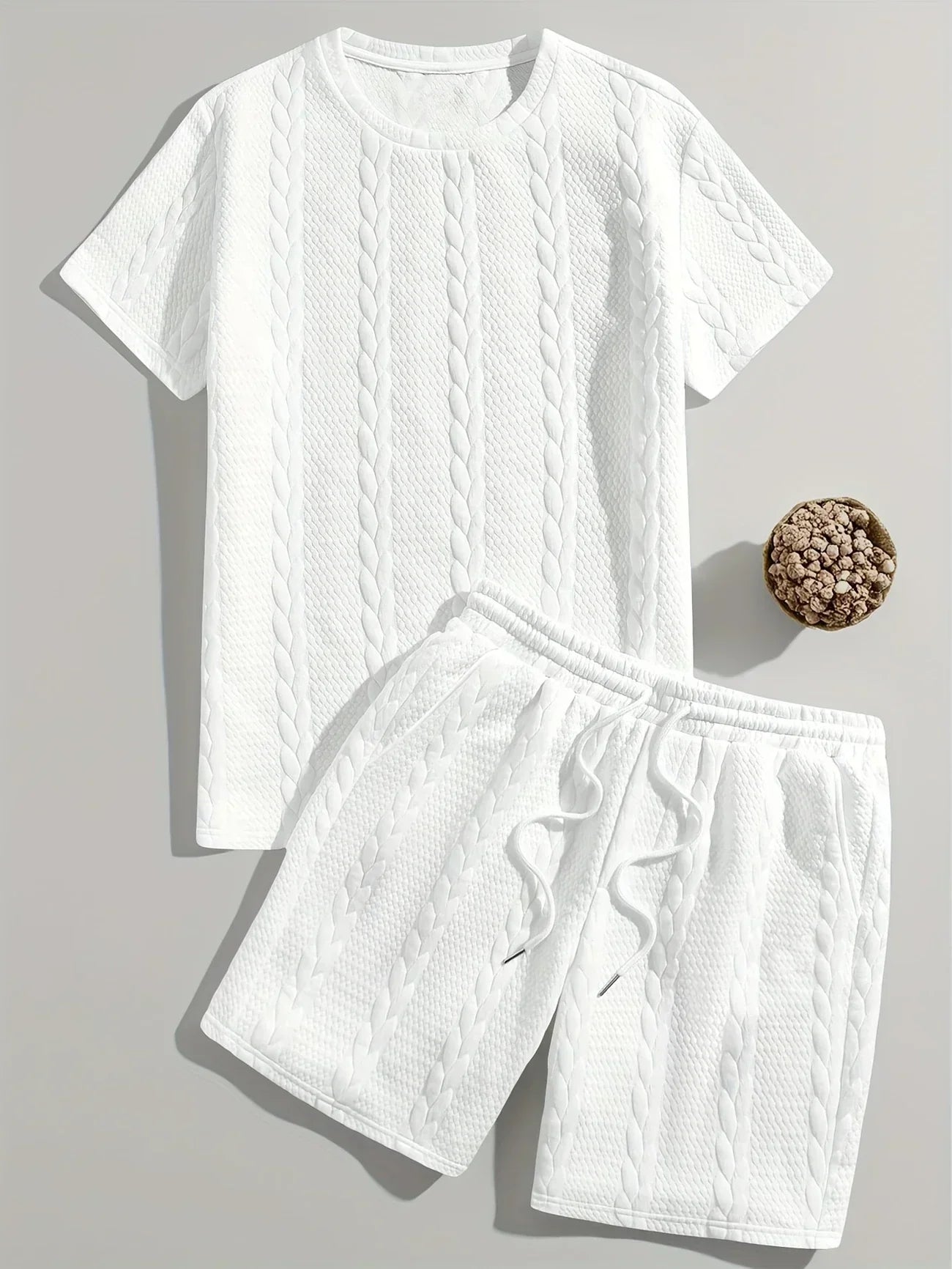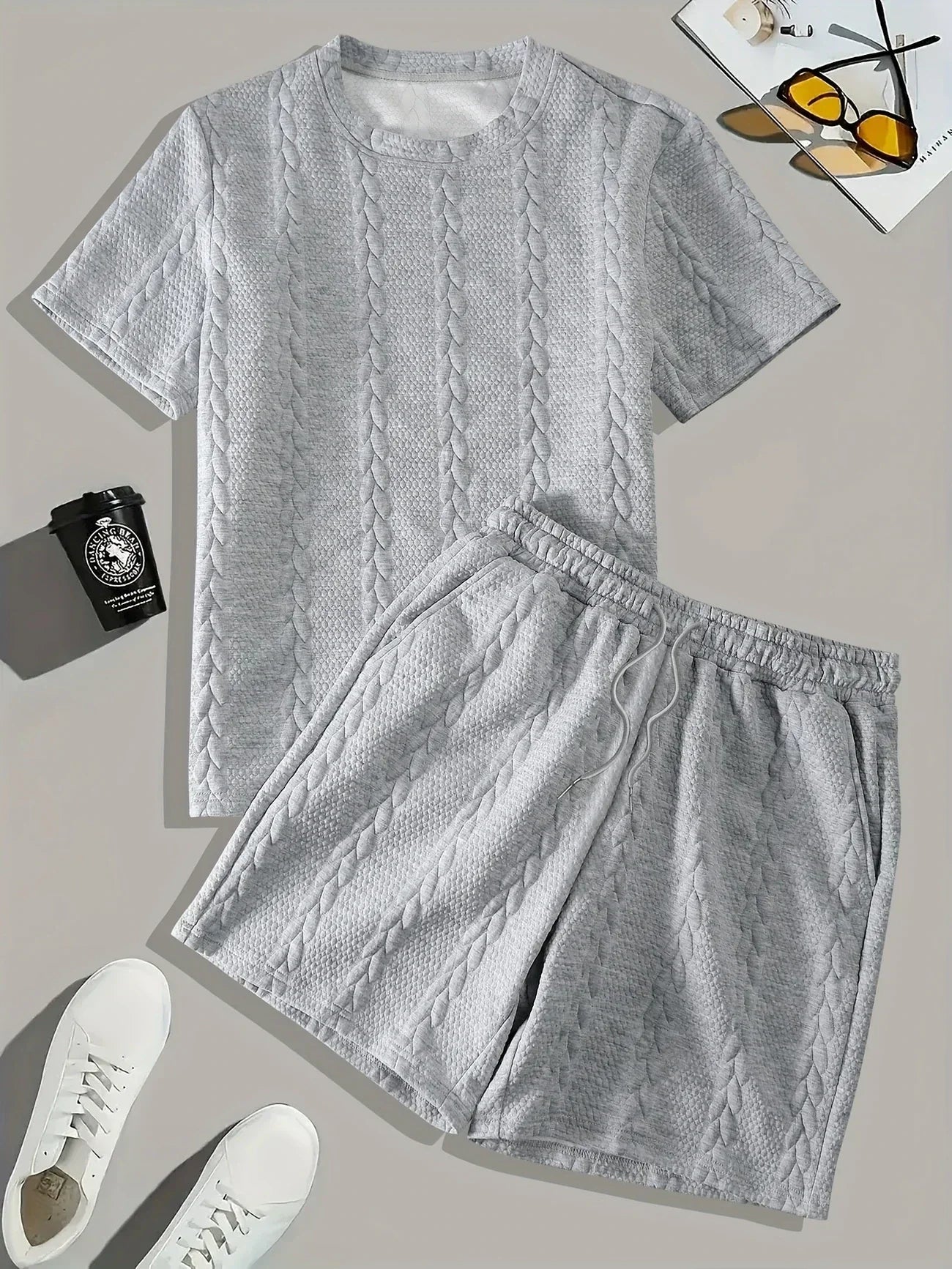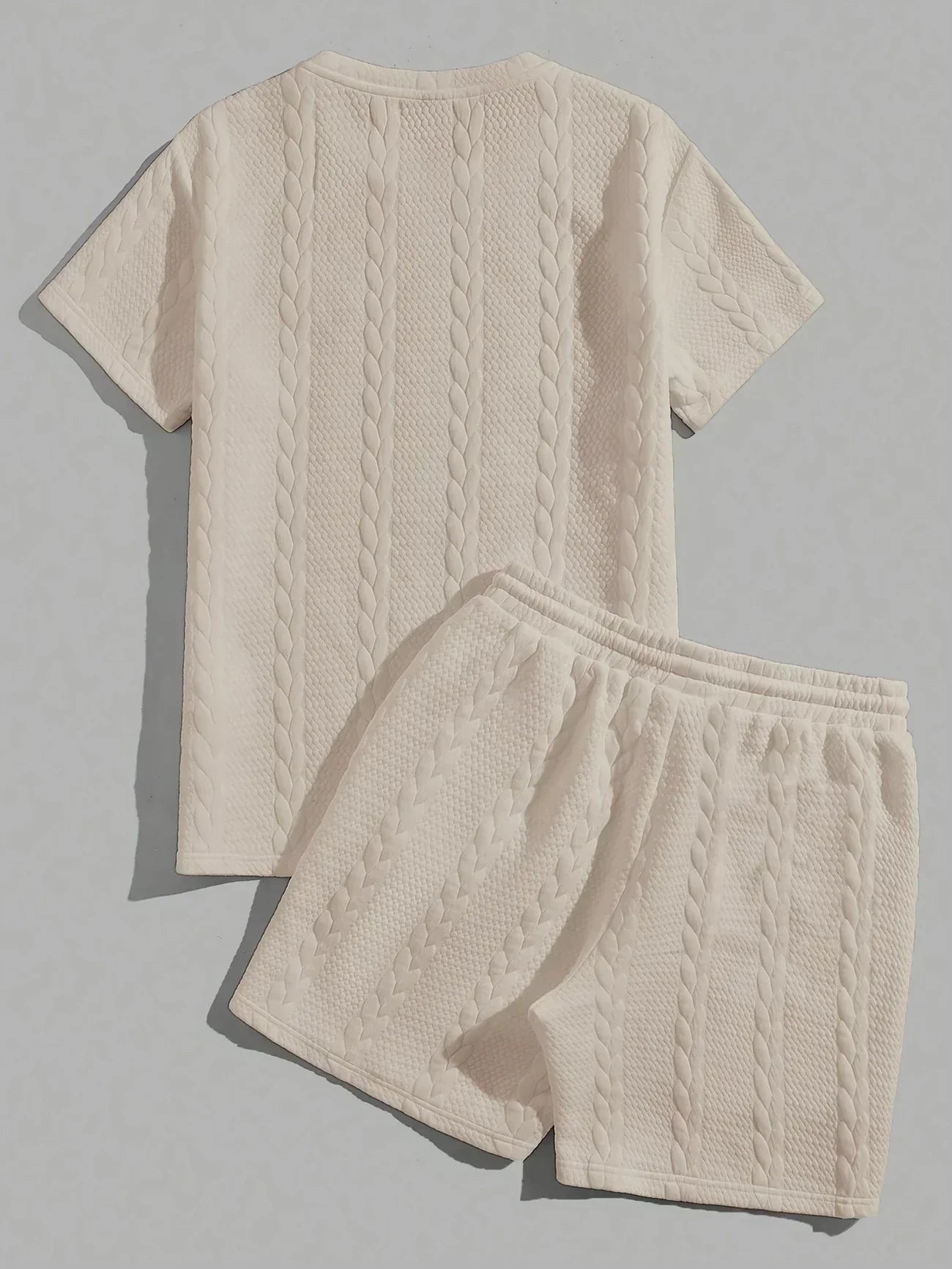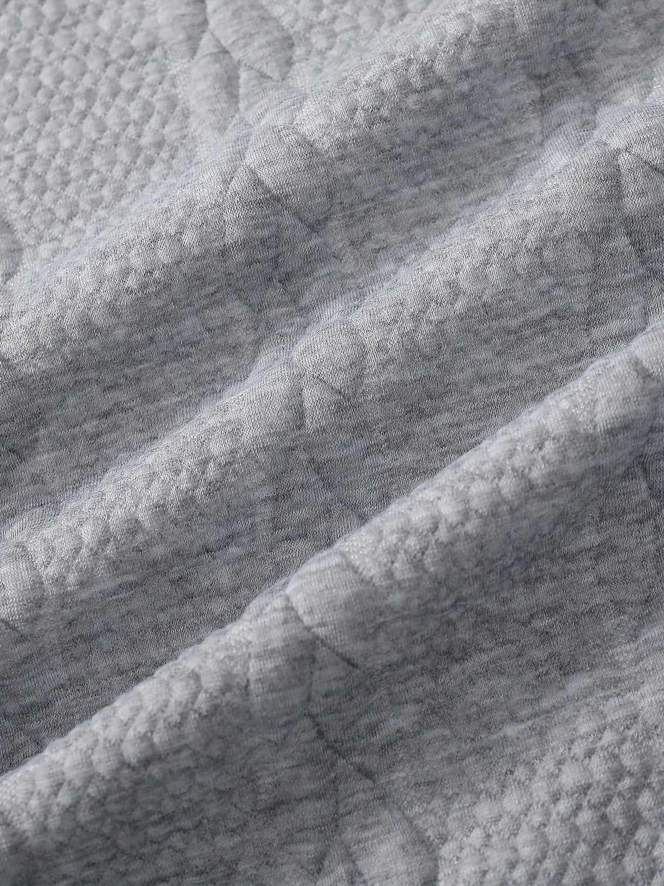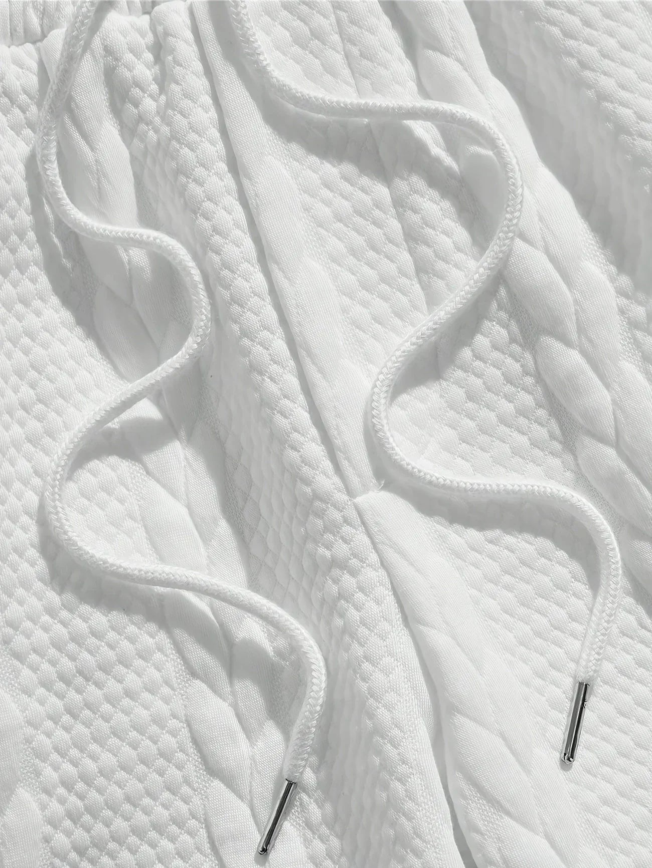 スタイリッシュなテクスチャードデザイン:  独自のケーブル編みパターンが特徴のこのセットは、クラシックなリラクシングウェアにモダンなアクセントを加えます。詳細なテクスチャが深みと視覚的な魅力を添え、単なるベーシックセットを超えたデザインです。クリーンなラインとミニマリストな雰囲気が、手軽にスタイリッシュにまとめるな印象を演出します。